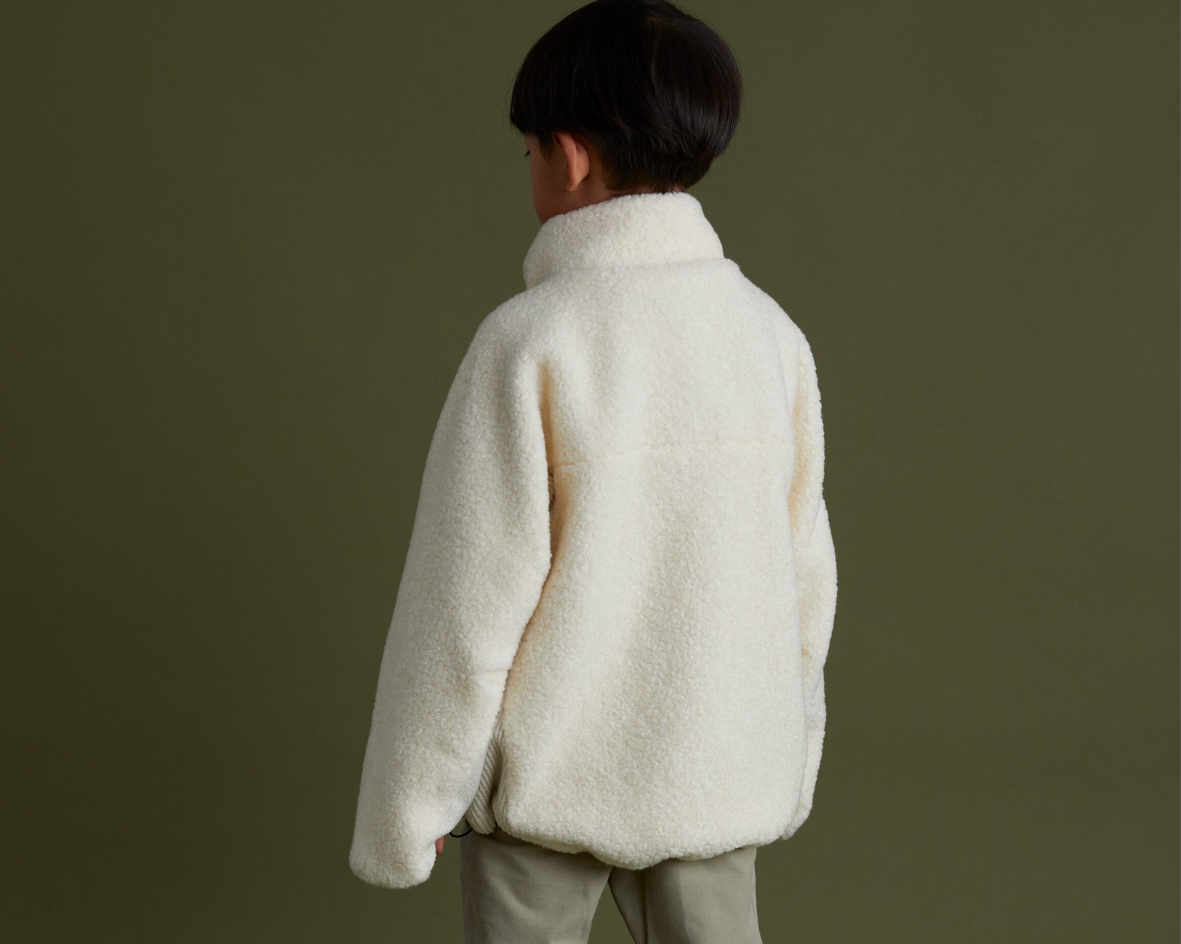 ボアは淡いクリーム色で、コーデュロイの切り替えがアクセントに。裏地はオーガニックコットンのキルティングをふんだんに使い、外も中も肌あたりがとても優しいジャケットです。