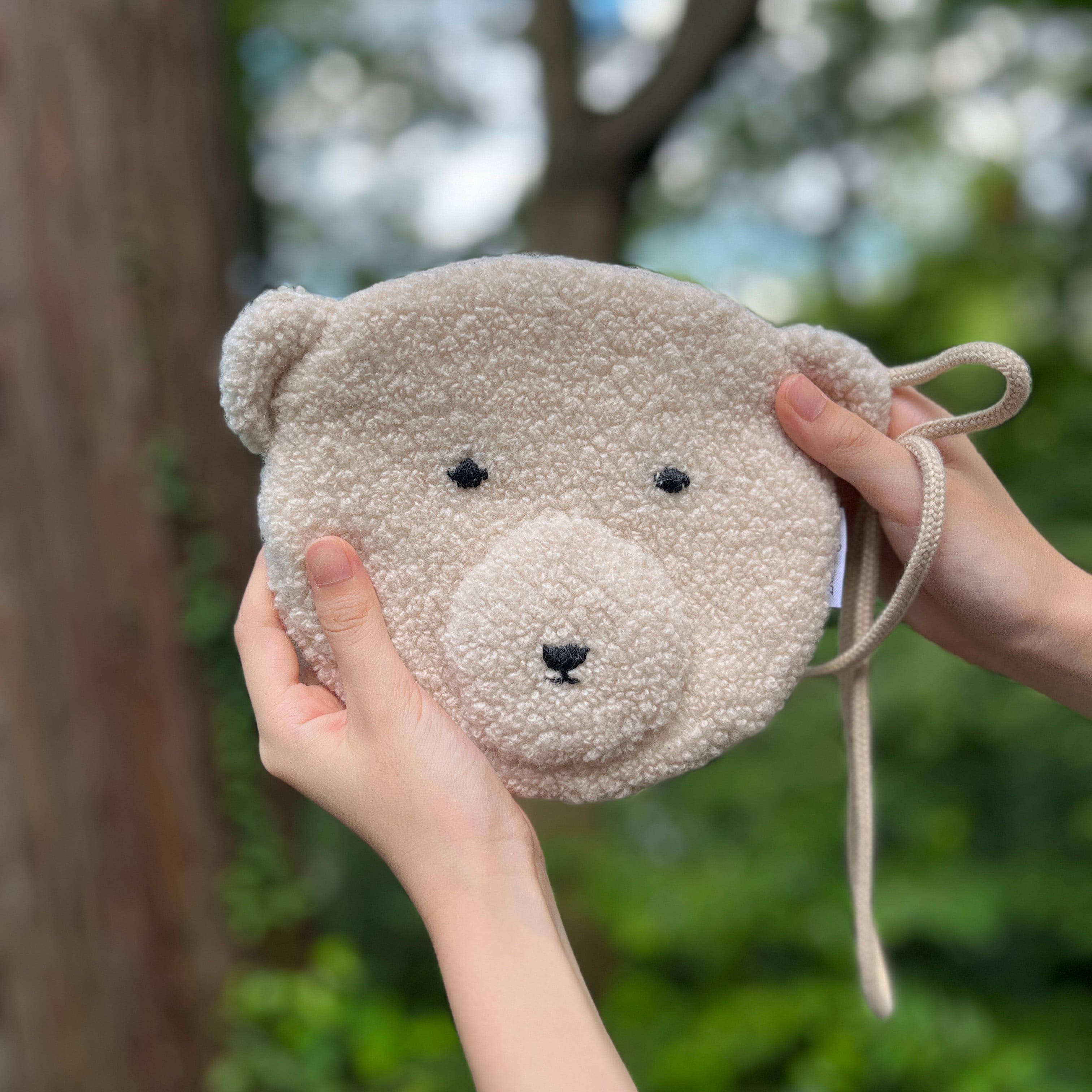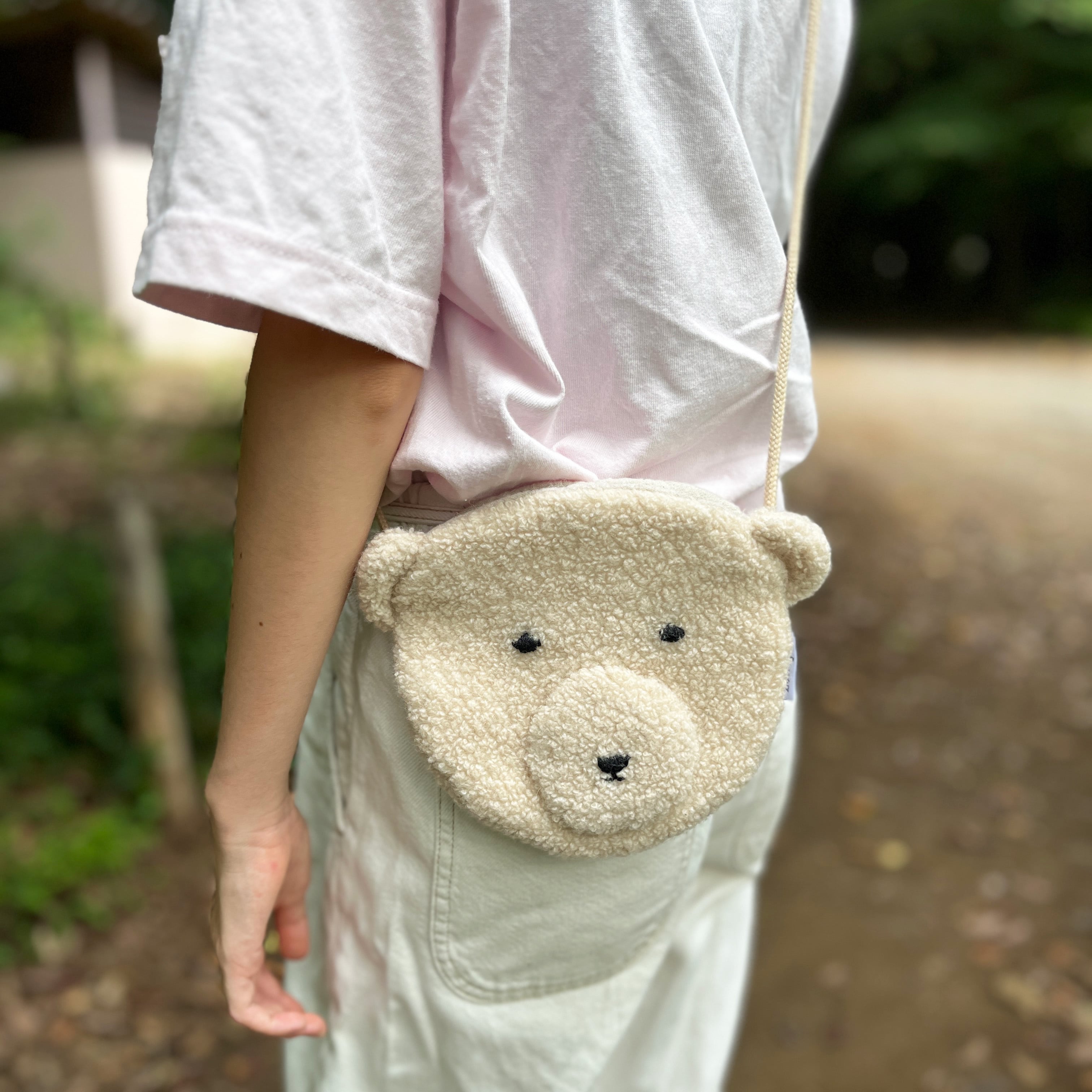 リサイクルウールのボアを使用した、ホッキョクグマをモチーフにしたポシェットです。